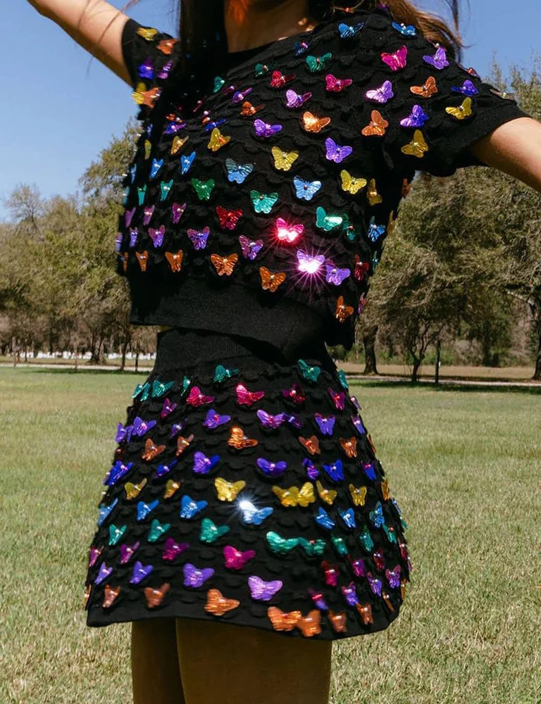 เซ็ตเสื้อยืดและกางเกงขาสั้นลายผีเสื้อแขนพัฟเซ็ตเสื้อยืดสำหรับผู้หญิงชุดเสื้อและกางเกงขาสั้นลายผีเสื้อประดับเลื่อมแบบสั้น2ชิ้น