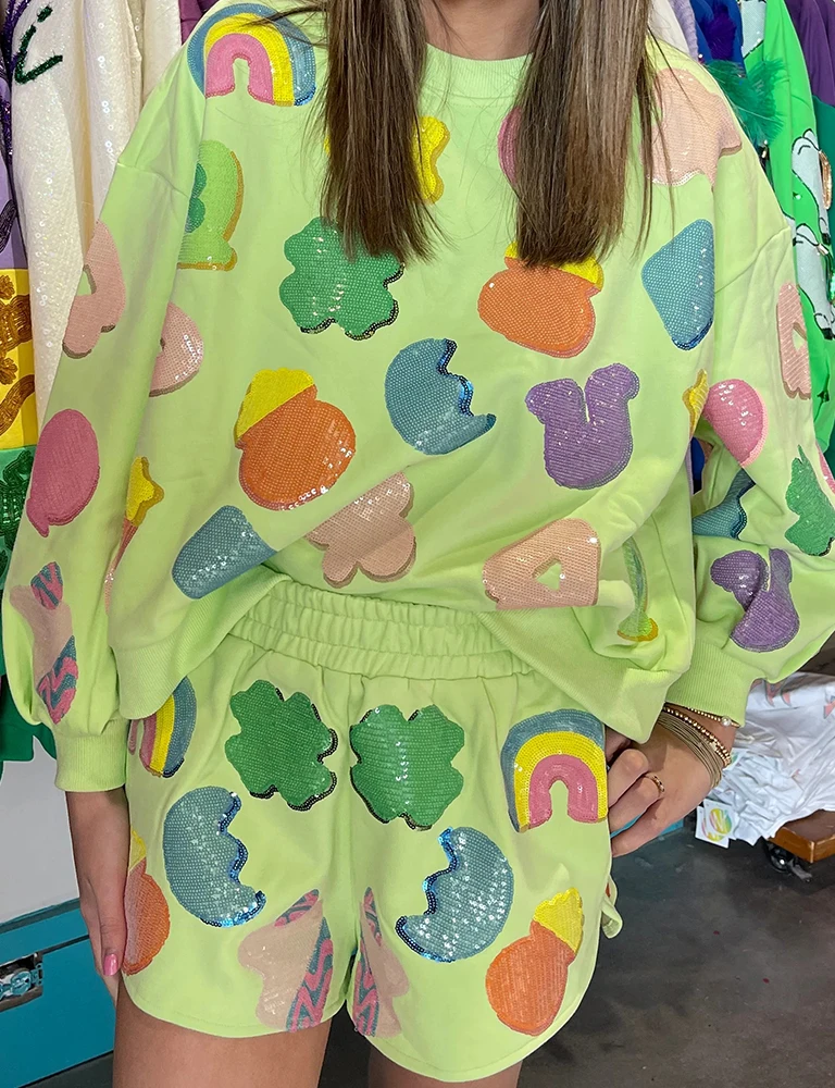 เสื้อสเวตเตอร์แขนยาวสำหรับผู้หญิงเสื้อสเวตเตอร์แขนยาวมาร์ดิกราส์ประดับเลื่อมมีชายเสื้อสเวตเชิ้ต